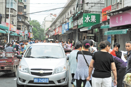 昨日早上7时许,一居民花了10多分钟才从沙湖桥街的“地摊早市”里驶了出来。 均为贺文兵 摄