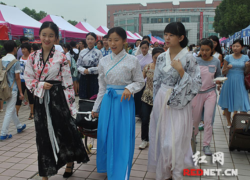 (身着传统汉服的“迎新队伍”引起了新生和家长的关注)