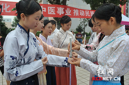 红网长沙9月6日讯(记者 刘怡斌 通讯员 张觅)今天上午,在湖南中医药大学含浦校区,一群身着传统汉服、手持银针艾条的特殊“迎新队伍”引起了新生和家长的关注。她们或向新生出示银针艾条,展现中医药文化特色;或为新生和家长指引路途,帮助他们提行李……这种集传统文化与贴心服务为一体的迎新方式,受到了新生们的欢迎。汉服迎新队伍也成为了成为了校园内迎新志愿者中一道靓丽的风景线。