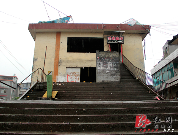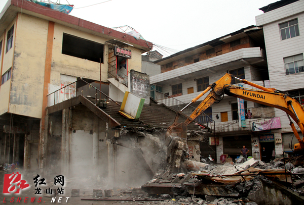 红网龙山站9月11日讯(通讯员 张军 向华)9月11日清晨,一块已经废弃了网吧招牌孤零零的挂在龙山县街中街入口处的上层,旁边是一面早已拆除掉玻璃的窗子,楼顶上着一面大型广告牌钢架虽然东倒西歪,却还依稀能找出此地曾经繁华过的痕迹。“开始拆除!”8时18分,随着施工方负责人一声令下,一辆挖掘机向街中街伸出了大臂,这座兴建于上世纪90年代末的商业建筑即将退出历史的舞台。