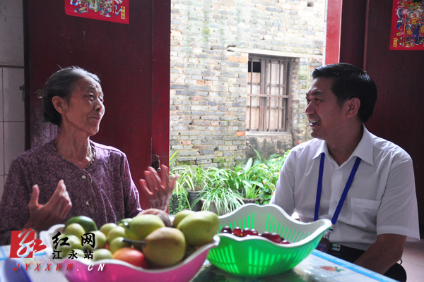 江永县委书记冯德校与退休老教师何淑清亲切交谈。首积亮/摄