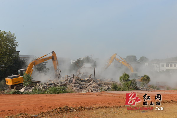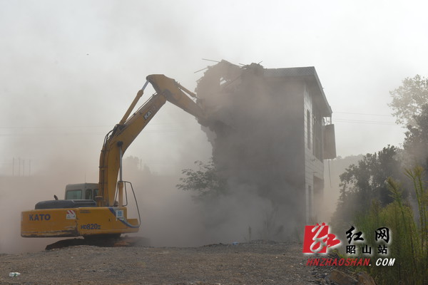 红网昭山站9月12日讯(通讯员 刘京虎) 9月11日上午,伴随着机器的轰隆声,大块砖石从屋顶掉落,腾起阵阵尘土,两台挖掘机对昭云大道K3段横亘于路中央的一栋两层房屋进行了拆除。