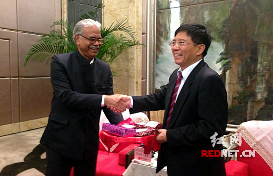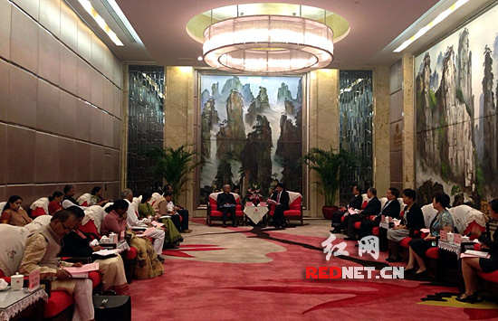 贾纳丹.帕蒂对此次会见和考察安排表示了感谢和问候。他说,考察团一行都非常荣幸能够来到毛泽东主席的故乡:“我们现在正在湖南进行访问,而习近平主席正在印度进行国事访问。我们都致力于发展中印两国良好关系,及良好的人民群众关系。”