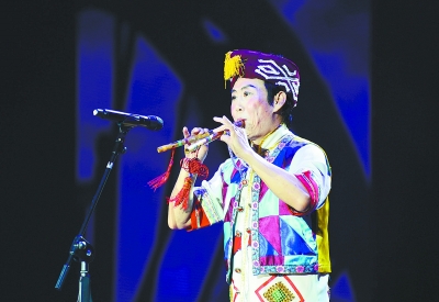 图为演员黄民祥表演侗笛独奏《鼓楼月夜》,带给现场观众一次又一次的听觉冲击。本报记者 李健 摄