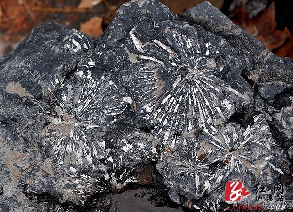 虽未经打磨,却能从菊花石的表层看到朵朵隐藏其中的菊花。菊花石的表层经过敲打,撬开岩层裂缝,出现了带有菊花图案的岩石,岩石上洁白的菊花十分清晰。“当时是有两块,一块比这块也还大。小的这块重大概有十多吨,还有一块大概有三十多吨,”石主人介绍这将是湖南目前出土最大一块的天然菊花石。