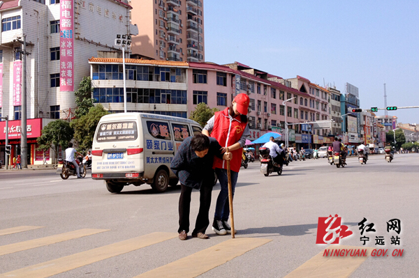 活动中,在九嶷路、泠江路交叉口发生了感人一幕,一名志愿者搀扶老人缓慢通过斑马线,引来市民纷纷拿出手机上前拍照。原来,老人家住宁远县冷水镇东城,已逾年80高龄,刚从中医院买药出来,因患腿部疾病,加上驼背,只能借助拐杖行走,走起路来十分不便,志愿者主动上前进行搀扶,直到将老人送上前往汽车总站的4路公交车。