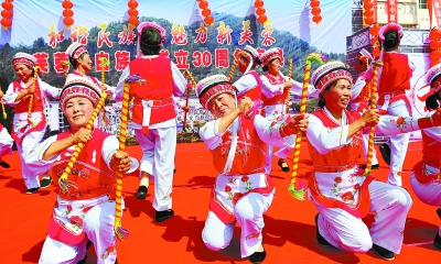 本报9月22日讯(记者 尹超 通讯员 易善任 朱德胜)今天,秋阳似火。上午10时开始,在桑植县芙蓉桥、洪家关、刘家坪等6个白族乡,身着白族服饰的乡亲,载歌载舞,热烈欢庆白族乡在该县成立30周年。庆祝活动得到了国家民委、省民委的重视与现场指导。作为白族祖居地,云南大理州州长何华带队前来祝贺。