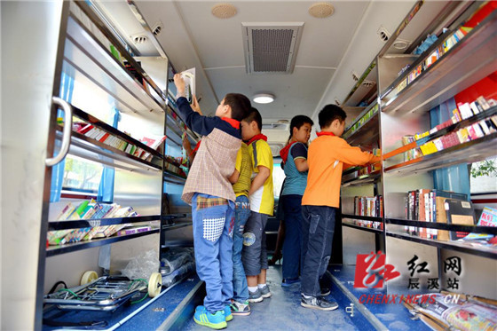 同学们正在流动图书服务车上借阅图书