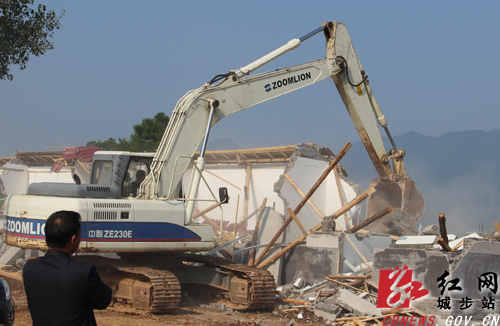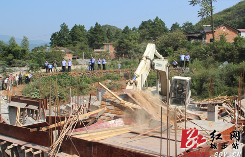 红网城步站9月24日讯(分站记者 肖丁勤)9月23日上午,城步苗族自治县人民政府组织国土、公安、建设、城管执法、儒林镇政府等相关单位执法人员和干部职工,对儒林镇双井村两处违章违法建筑进行依法拆除,严厉打击了违建歪风,确保了全县城乡建设用地依法规范有序开展。副县长王新在拆违现场指挥调度。被拆除的两处违建位于双井村四组,均在未取得合法用地手续的情况下擅自破土动工。双井村制砂场未经批准,在小地名麻哈山占用土地3.6亩,修建工棚及制砂场。王运锡未经批准,占用小地名冲口里土地近一亩修建房屋,现已完成地下室工程。在大型挖掘机强力推捣下,两处违建瞬间被依法摧毁推平。