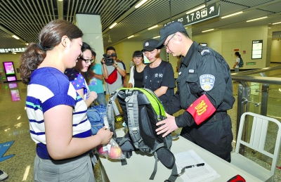 地铁长沙五一广场站,工作人员在检查乘客携带的背包。记者 田超 摄