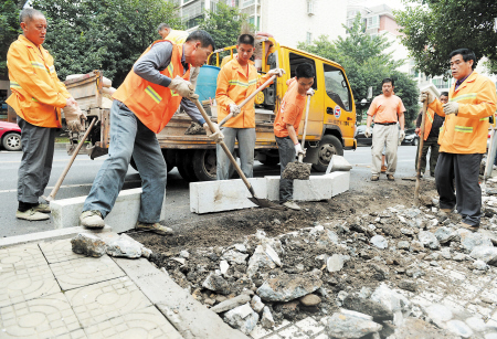 在炮机等机械设备的配合下,施工人员拆除私开的口子,还原了人行道。 石祯专 摄