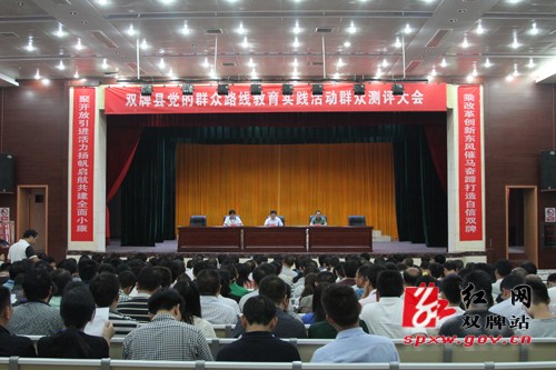 红网双牌站9月25日讯(通讯员 唐娟)9月24日下午,双牌县党的群众路线教育践活动群众测评大会在县礼堂召开,会议的主要任务是省委督导组对双牌县教育践活动开展情况进行群众测评,以进一步了解掌握教育践活动开展情况,实事求是评价活动成效,促进整改落实。省委派驻永州督导组成员、省编办综合处副处长杨峰,市委督导组李劲涛、彭新蓉、张月林到会指导。会议由县委副书记、县长魏和胜主持。