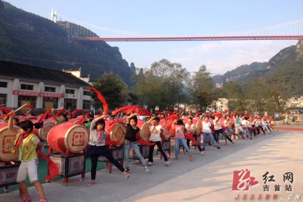 红网吉首站9月26日讯(通讯员 吴璇) 2014吉首国际鼓文化节开幕式即将举行,矮寨镇民族完小学生鼓队正紧锣密鼓地进行排练。此次演出任务重,排练时间紧,为妥善处理好排练与教师工作、学生学习的关系,矮寨镇民族完小的师生们充分利用一切休息时间加班加点进行排练。