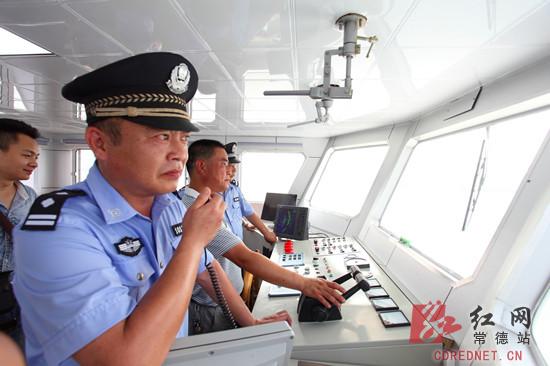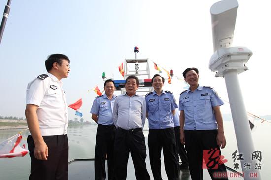常德市副市长朱晓平,副市长、市公安局局长胡丘陵登上公安艇