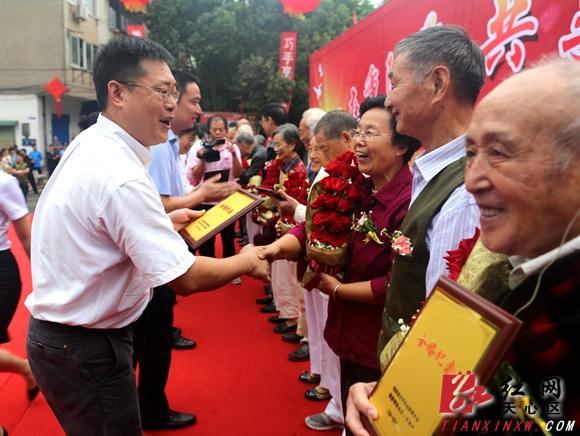 活动现场其乐融融、温馨热烈,在“浪漫金婚”送祝福环节,12对金婚老人的手紧紧攥在一起,幸福的接受在场所有人的祝福。在今年7月中旬,天心区委副书记、区长朱东铁收到了一封特殊的来信--火把山社区90岁高龄退休教师何冠煌老人致信,何老在信中表达了与老伴于金婚纪念日即将到来之际,希望得到政府和社会祝福的迫切愿望。在现场,何老作为金婚代表身着新装,胸前佩戴鲜花,满脸洋溢着幸福的笑脸,他感慨地说:“今天,我感觉很幸福,来了这么多的人与我们这些老年人共度重阳佳节,也很荣幸能够作为金婚老人代表在此发言,我要感谢党委、政府对我们共度金婚老人们的重视,委我们在这里举办了这么大的一个活动,虽然我们年纪大了,但是我们还有一颗年轻的心,我们还有一个为社会奉献微薄之力的心。我相信,也坚信,在共产党的英明领导下,在我们全社会的共同努力下,我们的生活将越来越富裕,越来越和谐,越来越幸福!”