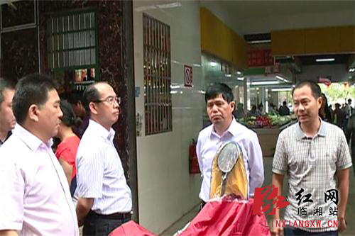 临湘市委副书记、市长龚卫国(右三)在长安集贸市场视察
