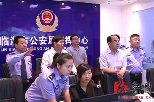 临湘市委副书记、市长龚卫国(右二)在公安局指挥中心调看监控画面