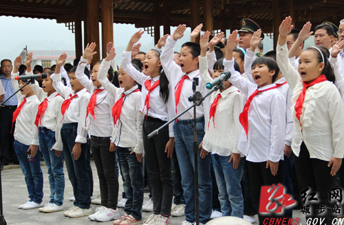 少先队员献唱《我们是共产主义接班人》。