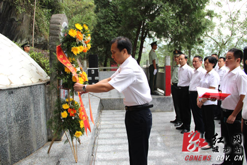 杨博理向红军烈士墓敬献花篮。