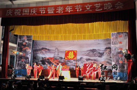 红网蓝山站9月30日讯(通讯员 杨雄春) 9月29日晚,蓝山县“欢乐潇湘”庆祝国庆节暨老年节文艺晚会在县政府大礼堂欢乐上演。台上表演者年龄大多已过半百,台下观众以老人和小孩为主。在一系列或大气磅礴、或天真无邪的表演中,现场时而掌声如潮,时而笑声连连,台上台下乐成一片。何冲龙、陈海潮、唐小明、盘德平、刘素萍等县领导到现场与广大群众一同观看演出。