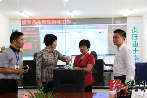 苏敏芳(左二)参观区医疗急救中心调度室。