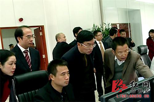 图为临湘市委书记黄俊钧(右二),市委副书记、市长龚卫国(右三)等领导视察机房