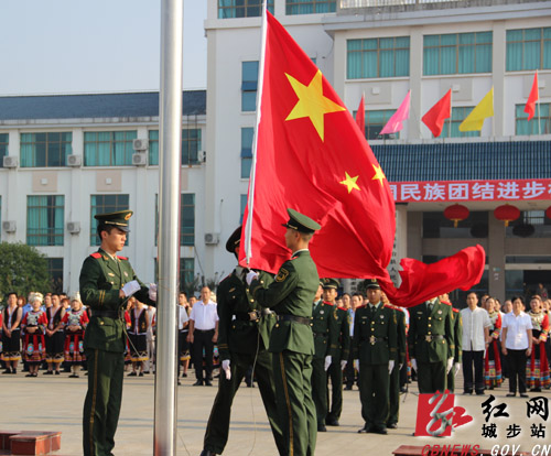 揭牌仪式开始前举行了升国旗仪式。迎着绚丽的朝霞,在雄壮的国歌声中,鲜艳的五星红旗冉冉升起,飘扬在苗乡上空,全体人员庄严肃立,向国旗行注目礼,共祝祖国繁荣昌盛。