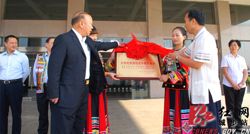 红网城步站10月8日讯(分站记者 肖丁勤)10月8日上午,城步苗族自治县在县行政中心广场隆重举行“全国民族团结进步模范县”揭牌仪式,县委书记罗建南出席并作重要讲话,县委副书记、县长杨博理主持揭牌仪式。县委、县人大、县政府、县政协、县人武部班子成员,县直机关单位干部600余人参加揭牌活动。