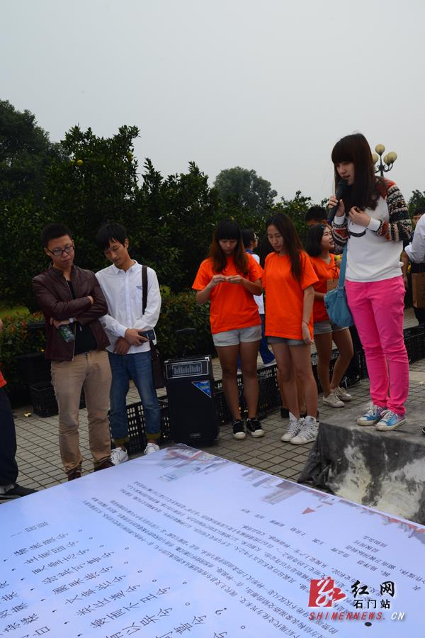 活动当天,一群年轻人登上舞台表演了“快闪”行为艺术,“小苹果”动人的旋律、舞者曼妙的舞姿,不时引得围观市民游客为之侧目,兴致高的还跟着舞蹈起来。“你是我的小呀小橘子.....”,歌词中把“小苹果”巧妙的改为“小橘子”,台下很多观众游客都听出来了,大家都会心一笑,纷纷赞叹节目创新、契合场合。在“装置”艺术表演中,一大堆石门橘子堆成塔状,只要观众游客流畅念完《橘颂》,即可获赠一袋橘子。活动吸引了不少人一试身手,不一会儿橘山就纷纷“装进”了游客的口袋里。