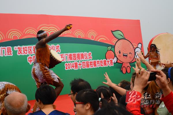 12日上午九点半,伴随着歌舞《欢乐毕兹卡》的开场,拉开了“石门橘红橘子洲”子活动的帷幕,橘子洲头毛泽东雕像广场顿时成为了一片欢乐的海洋。身着统一“石门橘子红了”字样红色服装的人群穿梭广场,“美丽乡村石门行”摄影比赛优秀作品展、吃橘大赛、“快闪”、“装置”表演,各种活动轮番上演,将橘子洲装扮得红透喜庆,而岳麓区与石门县缔结友好区县签约更将本场活动推向了高潮。