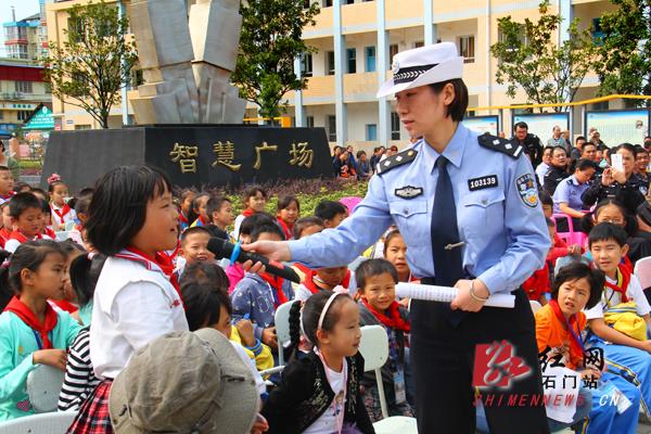 石门县交警大队负责人宣布石门县中小学生交通安全模拟演练活动正式启动。