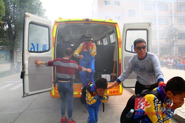 石门县交警大队负责人宣布石门县中小学生交通安全模拟演练活动正式启动。接下来分别进行了安全过马路演练、安全乘车演练和交通事故后应急防护与逃生演练。在安全过马路演练时,分别组织了闯红灯、规范过马路、步行上下学交通安全、安全乘车等演练活动,主持人还与学生现场互动,指出了不良的交通行为,讲授了规范的交通出行要求。随后举行的交通事故后应急防护与逃生演练扣人心弦。一台载有12名学生的校车行驶在道路上,突然迎面开来一辆越野车,越野车越线行驶与校车迎头相撞,校车发动机立即冒起了浓烟,随时可能发生自燃,校车前门严重受损无法打开,车内有部分学生受伤。碰撞发生后,校车司机立刻停车,迅速打开双闪警示灯和“停”车示意牌,在安全距离处设置三角警示牌,保护事故现场。校车照管员立即打开车上安全门,依次将12名受困学生全部安全救出,迅速撤离到离车辆50米外的安全区域,预防车辆油箱爆炸。校车司机同时拿出灭火器对准冒烟部位灭火,照管员用随车携带的急救箱对受伤较重学生进行包扎、止血等紧急处置。司机、照管员分别拨打“120”、“122”报警,几分钟后,医疗、交警、校车服务公司、学校相关人员赶到事故现场展开救援。