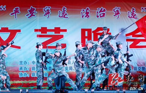 晚会由县民兵应急分队表演的开场舞蹈《追击》的优美舞姿中拉开序幕。紧接着,县政法系统民警们自编自演的小品《感动》、《向法官鞠躬》、杂技《力量组合》、小合唱《我们用生命书写誓言》、快板《宁远平安建设赞》、情景朗诵《平安颂》、舞蹈《和平使者》等节目,充分展现了全县政法民警们牢固树立“忠诚、为民、公正、廉洁”的核心价值观精神,热情讴歌了政法干警为构建和谐平安宁远而勇于担当、无私奉献的崇高品质;歌伴歌《直尕思得》、舞蹈《瑶家三月三》等节目,歌声感人动听,舞姿催人奋进,将整场晚会推向高潮。晚会在歌伴歌《共圆中国梦》的乐曲声中落下帷幕。近两个多小时的精彩表演,晚会汇集了舞蹈、小合唱、歌曲联唱、歌伴舞、小品、杂技、情景朗诵、快板等紧贴群众现实生活的艺术表现形式,演员们用歌声、舞姿和激情为现场观众献上了一道精彩的艺术盛宴,台上载歌载舞,台下如痴如醉,不时响起的欢呼声、掌声把台上台下连成一体,汇成了欢乐的海洋。通过晚会,进一步提高了广大干部群众对平安创建的知晓率,确保创建平安宁远各项措施落到实处,不断开创我县平安创建工作的新局面。晚会上,还为“创建平安宁远”征文活动获奖代表进行了颁奖。