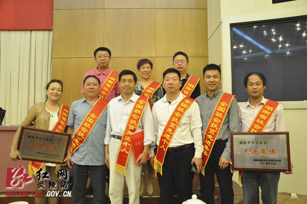 炎陵县公益志愿者协会获评"湖南省社会扶贫先进集体",前排右一为会长周新文