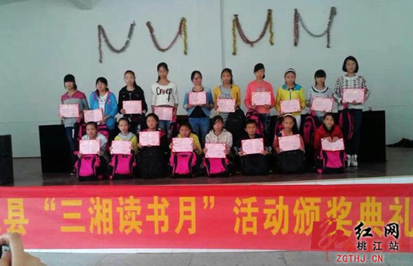 红网桃江站10月27日讯(分站记者 万成 曹爱英)金秋季节,桂蕊飘香,三湘四水,书声朗朗。为了展现桃江县少年儿童积极向上、努力学习、热爱生活、勇敢追梦的精神风貌,总结交流开展读书活动的经验和成果,10月24日,由县“三湘读书月”活动组委会主办,县图书馆和灰山港镇综合文化站承办的“三湘读书月”活动颁奖典礼在灰山港镇金沙洲中学隆重举行,表彰了一批在“三湘读书月”活动中涌现出来的先进典型。县委常委、县委宣传部部长胡国清出席颁奖典礼并为获奖师生颁奖。胡国清在颁奖典礼上讲话,他充分肯定桃江县校园良好的读书氛围,号召师生们多亲近书本、融入书本,为精神打底,为人生奠基,与经典为友,与博览同行,为营造桃江美丽的书香校园而努力。