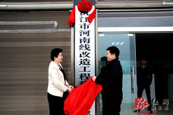 (沅江市委书记邓宗祥,市政协主席、河南线改造工程指挥部指挥长李丽君为工程揭牌 金磊 摄)