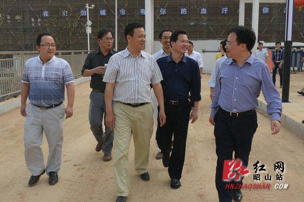 区党工委书记杨晓军向杨真平介绍昭山大道建设情况。