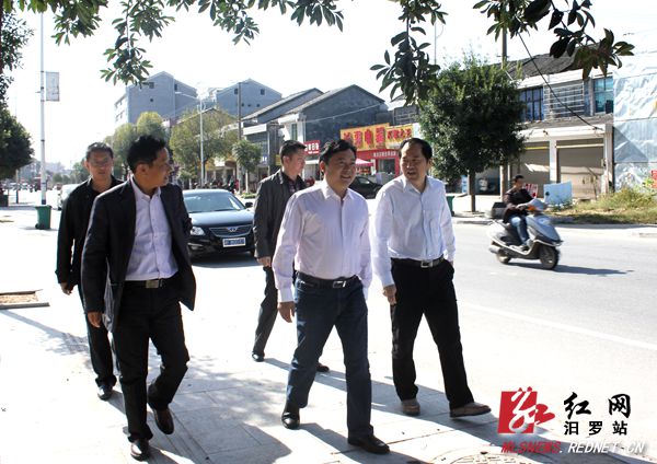(岳阳市副市长熊炜(中),汨罗市委常委、常务副市长彭千红(右)视察黄柏集镇建设)