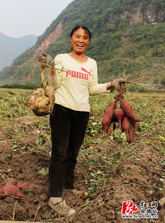 (村民提着自己种植的红薯,乐得合不拢嘴)