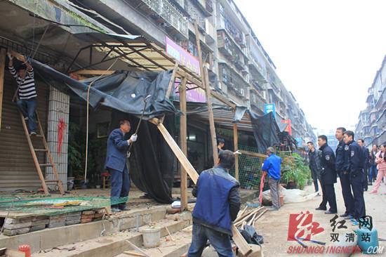 根据“创国卫”、“创文”的工作要求和附近居民的强烈反响,双清区“创卫办”联合东风路街道办、区城管局、邵水桥社区等部门,对花鸟市场内的经营户多次进行宣传引导,对出店经营、占道经营现象多次进行整治,但效果不很理想。为了彻底根治这一“顽疾”,双清区相关部门经过认真研究,决定依法依程序对市场内随意搭建的花棚、鸡圈,长期堆积的杂物、种植的蔬菜进行拆除和清理,并要求市场内的住户不要随意占据消防通道,积极配合邵阳市“创国卫”和“创文”工作的开展。