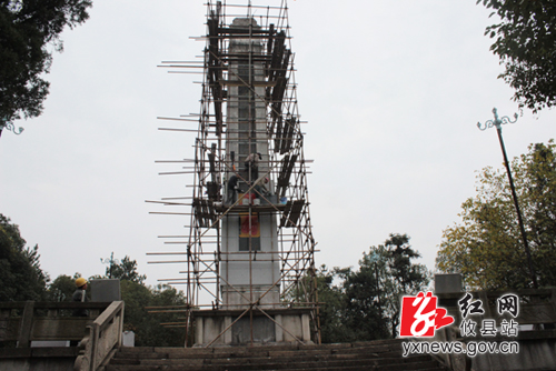 施工人员对县烈士陵园烈士纪念碑进行修缮
