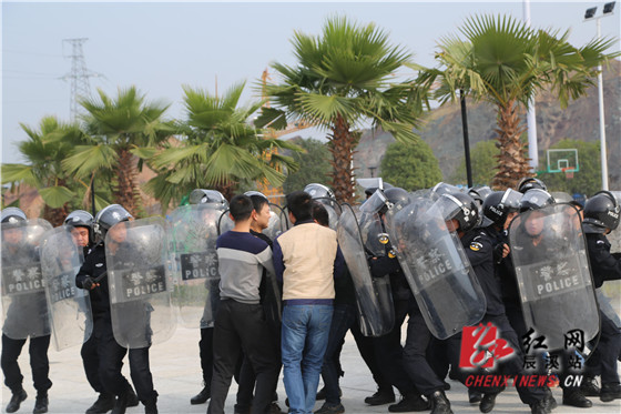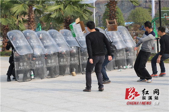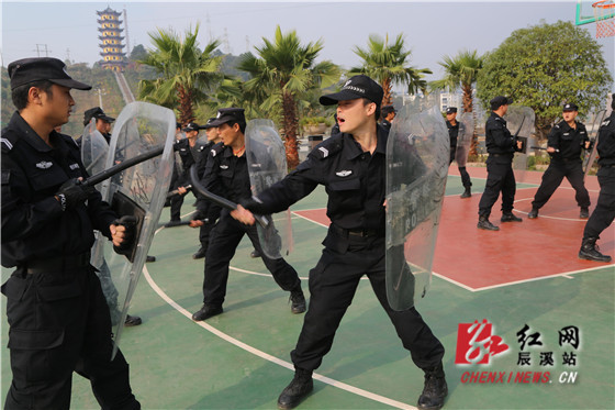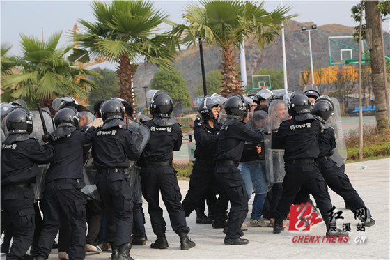 红网辰溪站11月20日讯(通讯员 孙海波)“一伙涉恐份子携带凶器气势汹汹地冲入县体育广场,企图闯入由特警组成的封锁线,一场暴力袭击眼看马上就要发生……在现场指挥员的组织下,特警们顶住涉恐份子水瓶、砖头的袭击,他们不断变化防护队形和进攻队形,最终成功控制局势,成功抓捕多名带头人。”这样的场景,并不是在拍警匪片,而是辰溪县公安局巡特警大队举行的防恐处突应急演练中的一幕。11月19日,经过15天的集中训练,辰溪县公安局冬季防恐处突应急演练成功结束。本次集中演练共出动巡特警400余人次,进行了运用武器警械、快速反应、紧密协作、果断处理、迅速平息事态、防恐处突等课目的演练,巡特警们还集中开展了擒敌拳和盾牌操的练习。