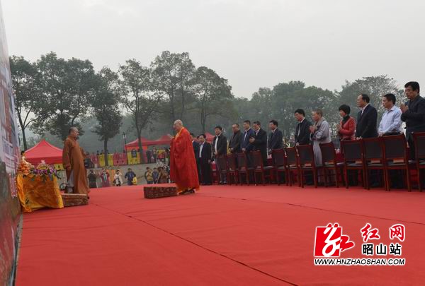 红网昭山站11月23日讯(通讯员 胡宁 方芳 摄像 刘京虎)“我宣布,昭山古寺大修正式动工。”11月22日上午,昭山古寺落架大修动工祈福仪式在昭山风景区举行,圣辉大和尚宣布古寺大修正式启动。修缮后的昭山古寺将重现唐宋风采,成为昭山一道全新的风景。参加当天祈福仪式的有全国人大代表、中国佛教协会副会长、湖南省佛教协会会长圣辉大和尚,湘潭市委常委、副市长杨广,长沙市政协副主席、市工商联主席彭继球,市政协副主席李光泉,省民宗委宗教一处处长柏桓,省佛教协会秘书长、南台寺方丈怀辉法师,市委统战部常务副部长周星,市工商联党组书记、市委统战部副部长赵美林,市政府副秘书长唐煜,市商务局局长黄韧,岳塘区区委书记孙银生,昭山示范区党工委书记杨晓军,岳塘区区委副书记、区长王永红,上海惠天然投资控股集团有限公司副董事长胡斌,全国人大代表、湖南省工商联副主席、湖南友阿集团董事长胡子敬,全国人大代表、湖南省工商联副主席、天下凤凰公司董事长叶文智,全国人大代表、湖南省工商联副主席、老百姓大药房连锁有限公司董事长谢子龙,全国人大代表、湖南省工商联副主席、永清环保董事长刘正军,湖南省工商联副主席、湘银投资集团总裁齐建湘,昭山示范区党工委副书记、管委会主任成秋兴,市民宗局局长吴岗山,市文广新局副局长王霓,市文物局局长肖迪民,市佛教协会会长释渊博法师,昭山古寺住持释行变法师等。