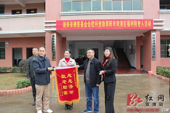 红网双清站11月26日讯(分站记者 赵绍君)11月25日,省佛慈基金会秘书长周仲山(左二)在邵阳市双清区民政局负责同志陪同下,到区福利院慰问资助老人,捐赠现金5万元。这是省社会组织对我区开展“助学、助医、助老、助困”“四助”公益活动的延续,其目的是弘扬中华民族传统美德,传递社会正能量,关心、帮助社会困难群众,发挥社会组织公益作用。