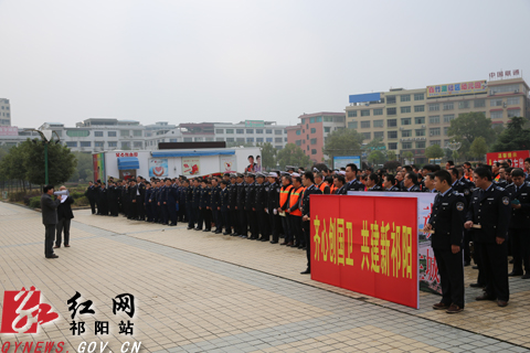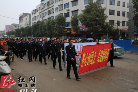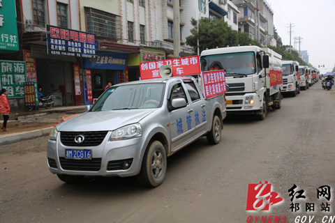 游行活动中,城管、环卫、交通、交警、工商、食药、卫监、质监等九支方阵着装统一、步伐整齐,高举“齐心创国卫,建设新祁阳”等宣传展板,环卫绿化处出动10余台卫生清扫车,组成了近200米的游行队伍,从县城白竹湖广场出发,沿民生路、人民东路、人字街、莲子塘、陶铸路、人民西路,缓步途经县城主要街道,进行沿街宣传。