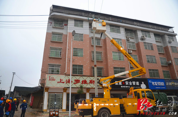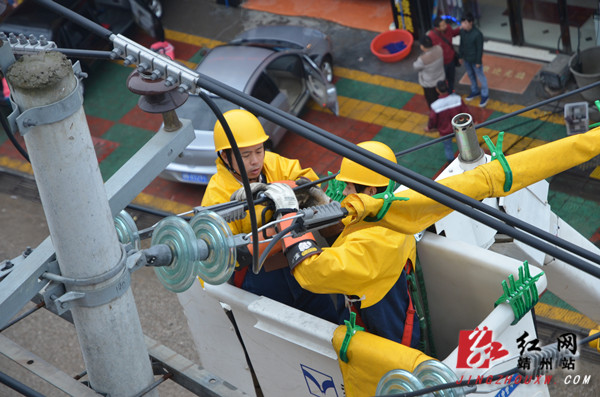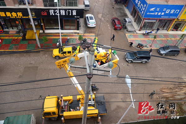 红网靖州站11月28日讯(分站记者 陈俊名 通讯员 石云昌) 11月26日,靖州县建国路的电力施工现场正在进行10千伏配电网带电安装接地环作业,这是靖州电力公司首次联合怀化市供电公司开展10千伏带电作业,为靖州县减少停电,提高供电稳定性,提升优质服务进一步夯实基础。