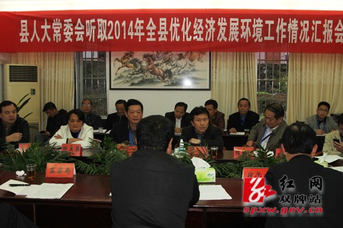 红网双牌分站12月1日讯(通讯员 唐娟) 11月28日下午,双牌县人大常委会听取2014年全县优化经济发展环境工作情况汇报会在县纪委会议室召开,双牌县人大常委会主任唐冬华,县委常委、纪委书记唐晓波,县人大副主任袁小爱、邓美英、邓明义、吕保和、姜国文以及县人大、纪委相关负责人参加会议。