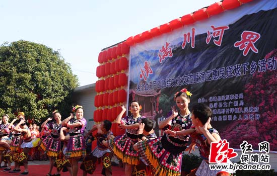 红网保靖站12月9日讯(分站记者 张承印 通讯员 田方) 秋风送爽川河界,歌舞传载民族情。12月8日,由保靖县民族事务局、文广新局主办,保靖县野竹坪镇和秀山县涌洞乡承办的湘渝边界民族文化交流活动暨演艺惠民送戏下乡——情满川河界文艺演出在野竹坪镇政府隆重举行。保靖县人民政府副县长胡勤,旅游局局长梁云,民族事务局局长彭美桃,文广新局局长邹佳利,秀山县旅游局局长于少龙,涌洞乡党委书记喻涛等人员出席了活动。