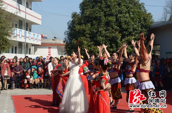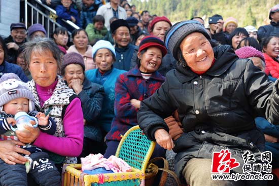 活动现场人潮如织,场面火热,来自两县的文艺队欢聚一堂,共演一台和谐戏,同唱一首欢乐歌,为野竹坪镇人民群众献上一场精彩的视觉盛宴。曲风高亢,旋律优美的《湘西酒歌》、《在希望的田野上》等歌曲让群众听得如痴如醉,风趣幽默的小品《莫把老人当排球》让观众们捧腹大笑的同时引发对孝敬老人的中华美德的思考;笛子演奏《京调》和二胡演奏《赛马》余音绕梁;富有涌洞乡和野竹坪镇地方特色的歌舞《传花灯》和《映山红》等节目让群众们沉浸在浓郁的民族风情之中。在两个小时的文艺演出中,丰富多样节目种类,精彩绝伦的表演让现场高潮不断,这种“接地气”的文化形式获得百姓阵阵喝彩。