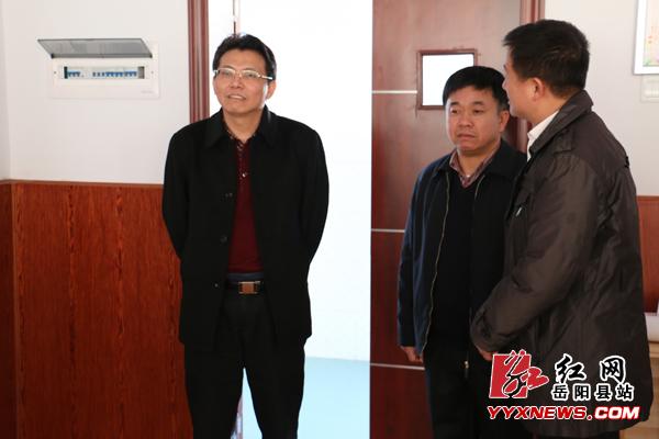 岳阳县委书记毛知兵(左一)察看幼儿园室内建设情况
